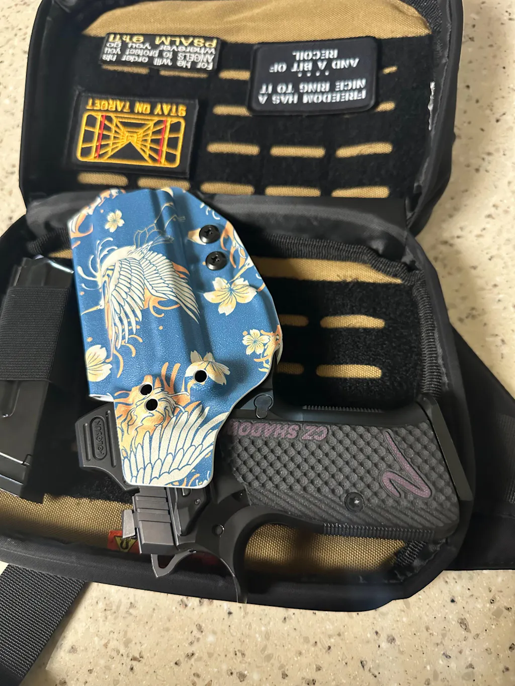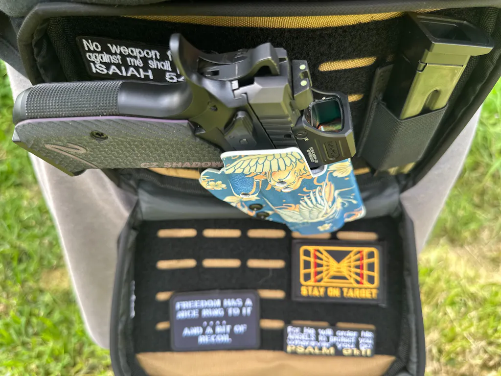Built around our proven Rev-Con™ full-Kydex holster and paired with the Rev-Con Velcro Adapter, this setup delivers secure retention, fast access, and modular positioning inside your bag while maintaining full trigger coverage and compatibility with modern handgun setups.