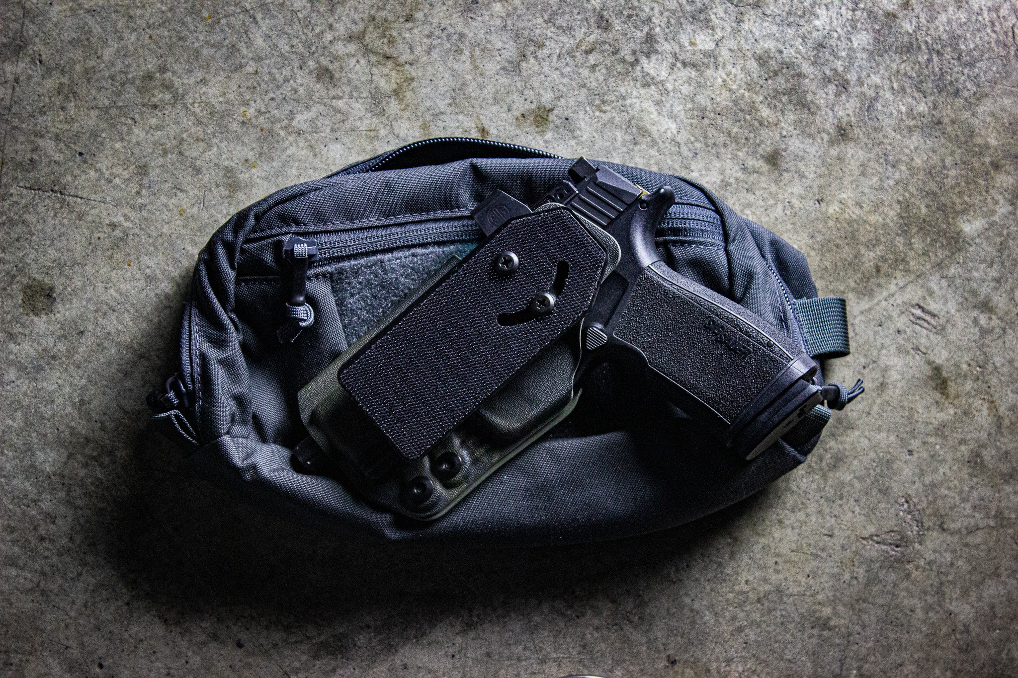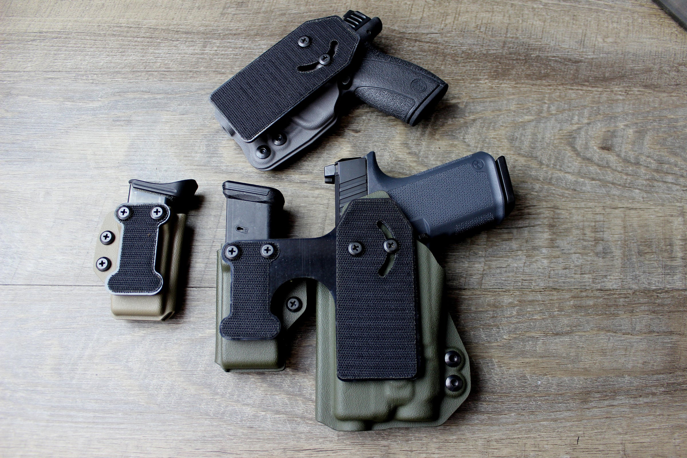 Purpose-built holsters, mag carriers, and adapters for Velcro-ready bags.